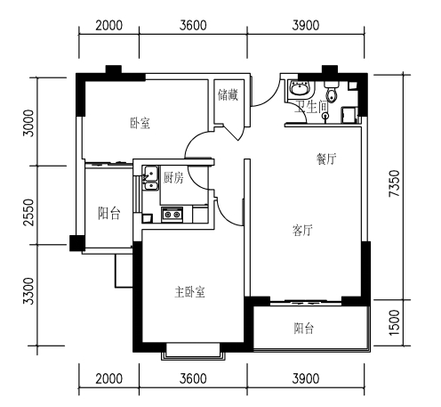 A3戶型84平米二室二廳一廚一衛(wèi)